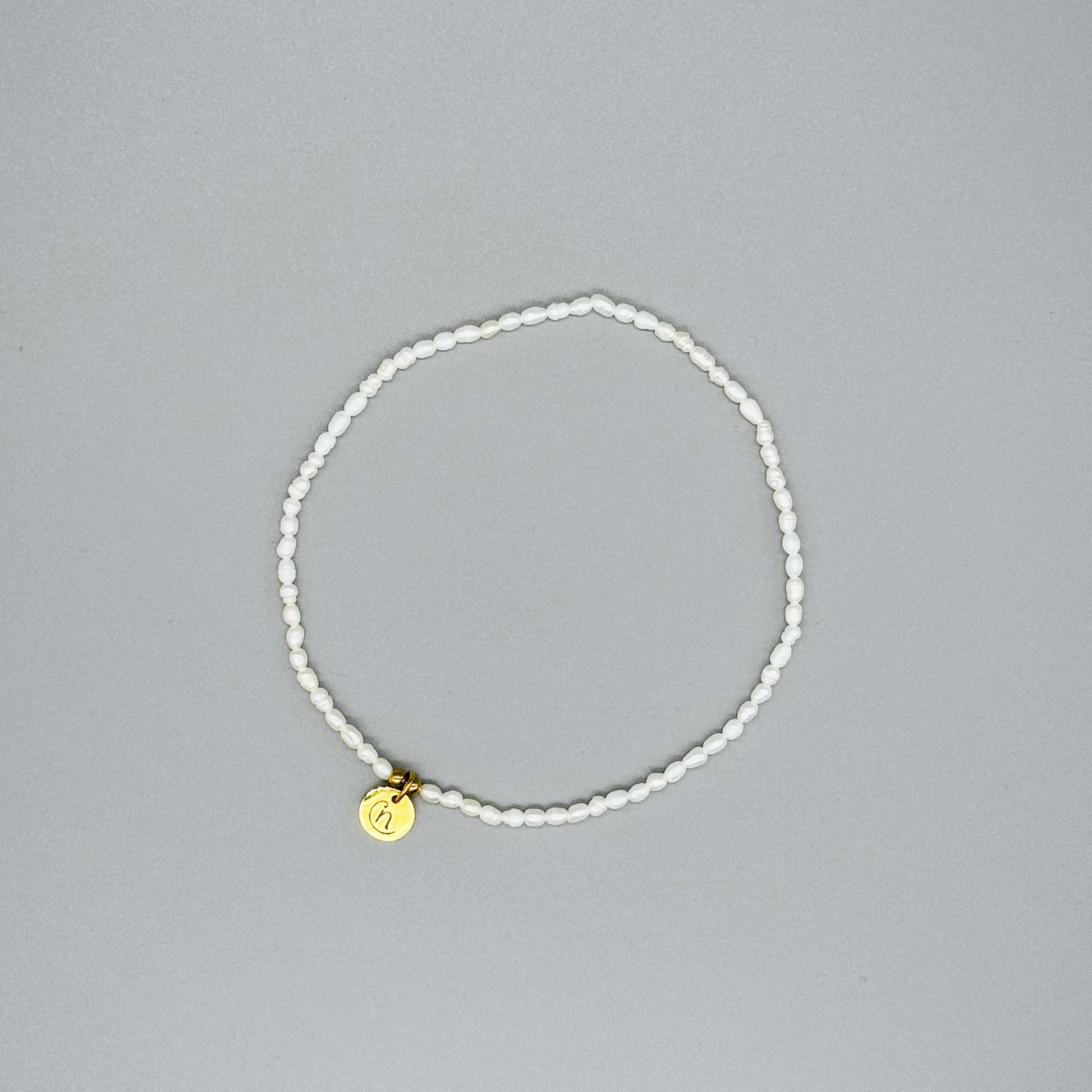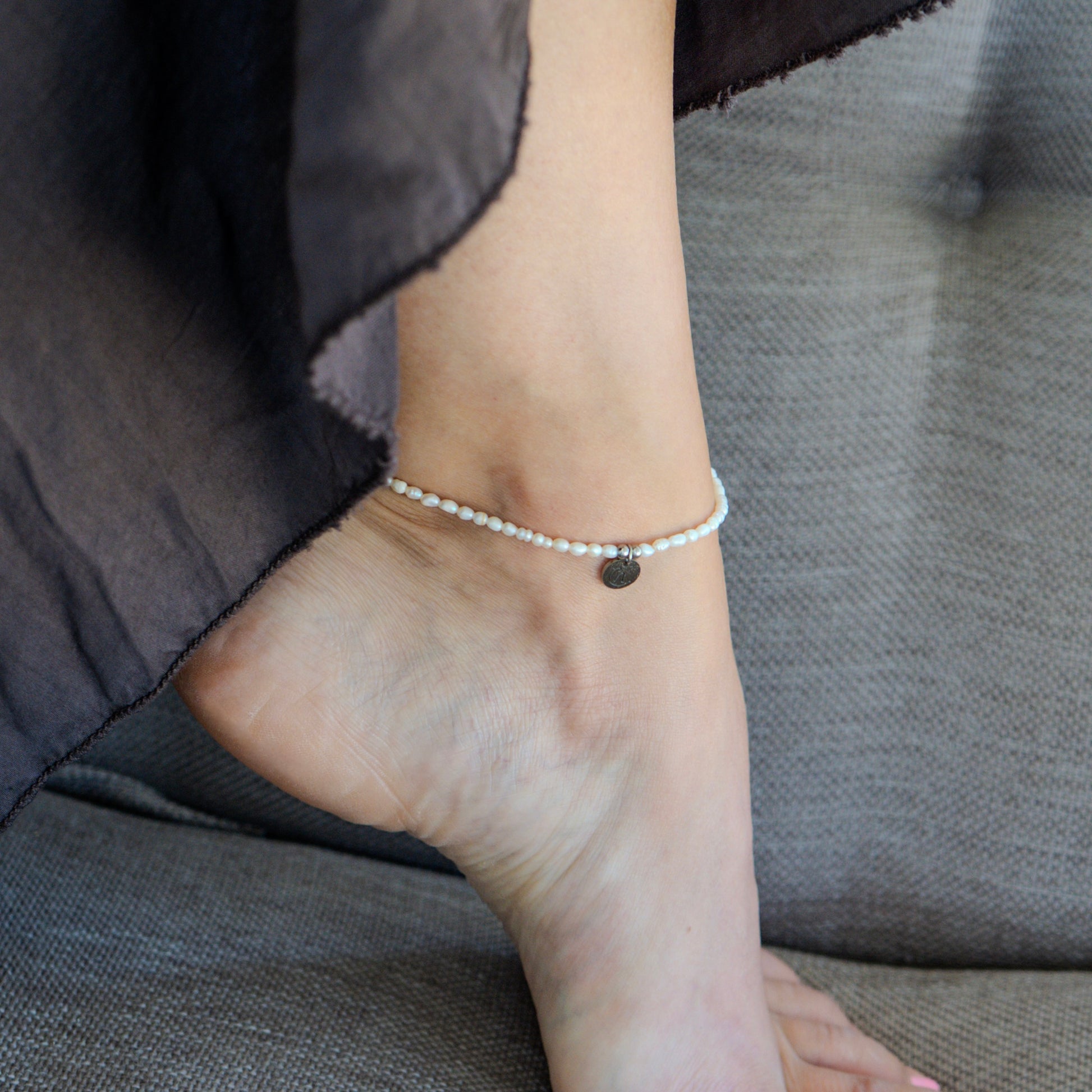 Деликатна гривна за глезен от естествени перли и стоманени елементи в златно и сребърно.