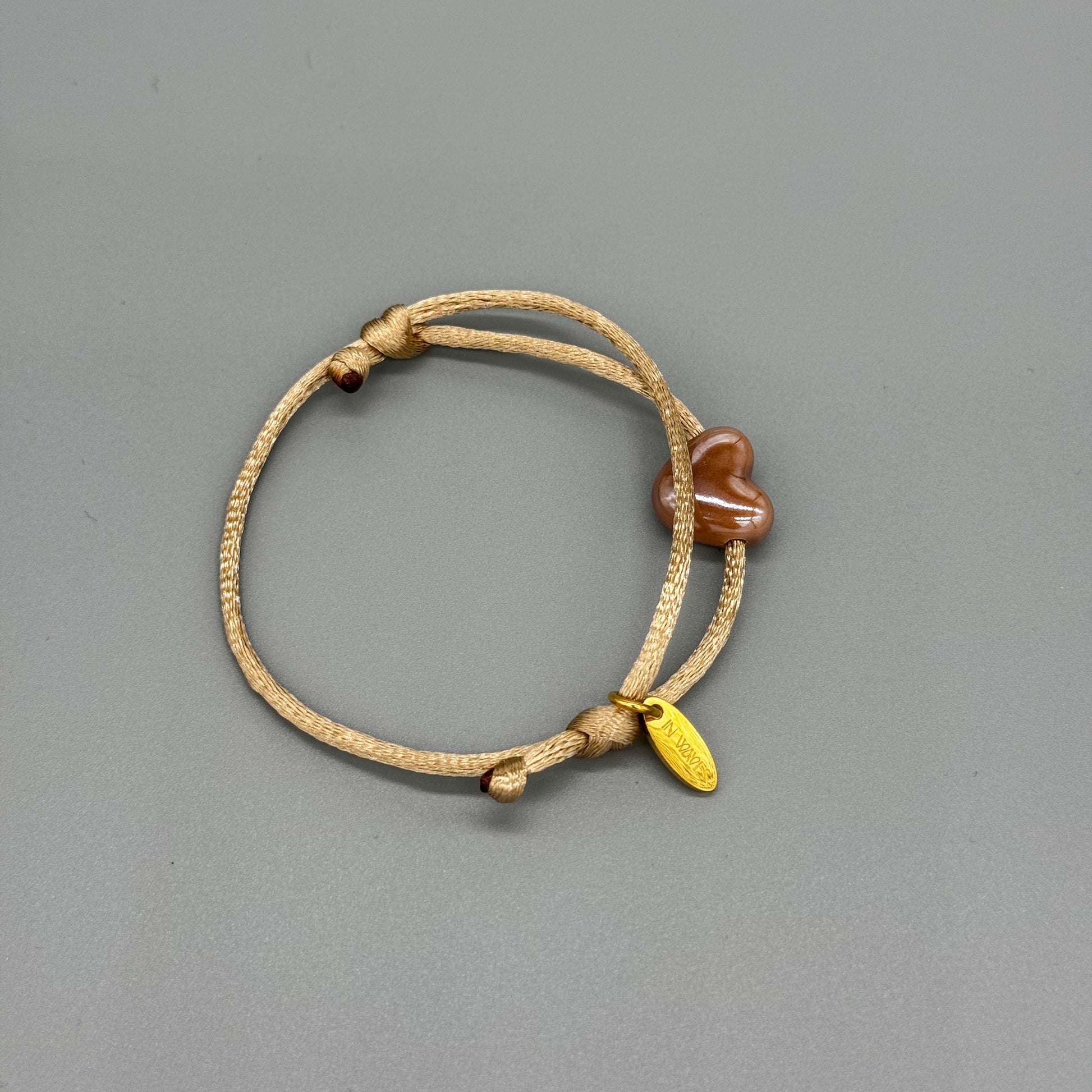 „Caramel love“ е нежна гривна, изработена от сатенен конец и керамично сърце. Удобна за носене, без стърчащи краища и с регулируема дължина. Идеалният, небрежен аксесоар.