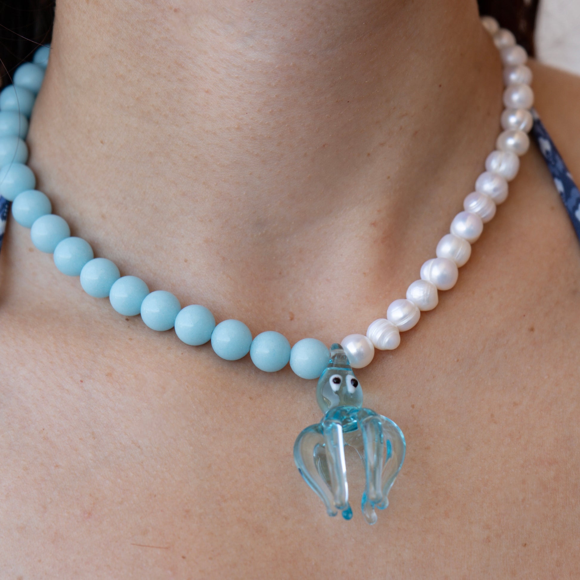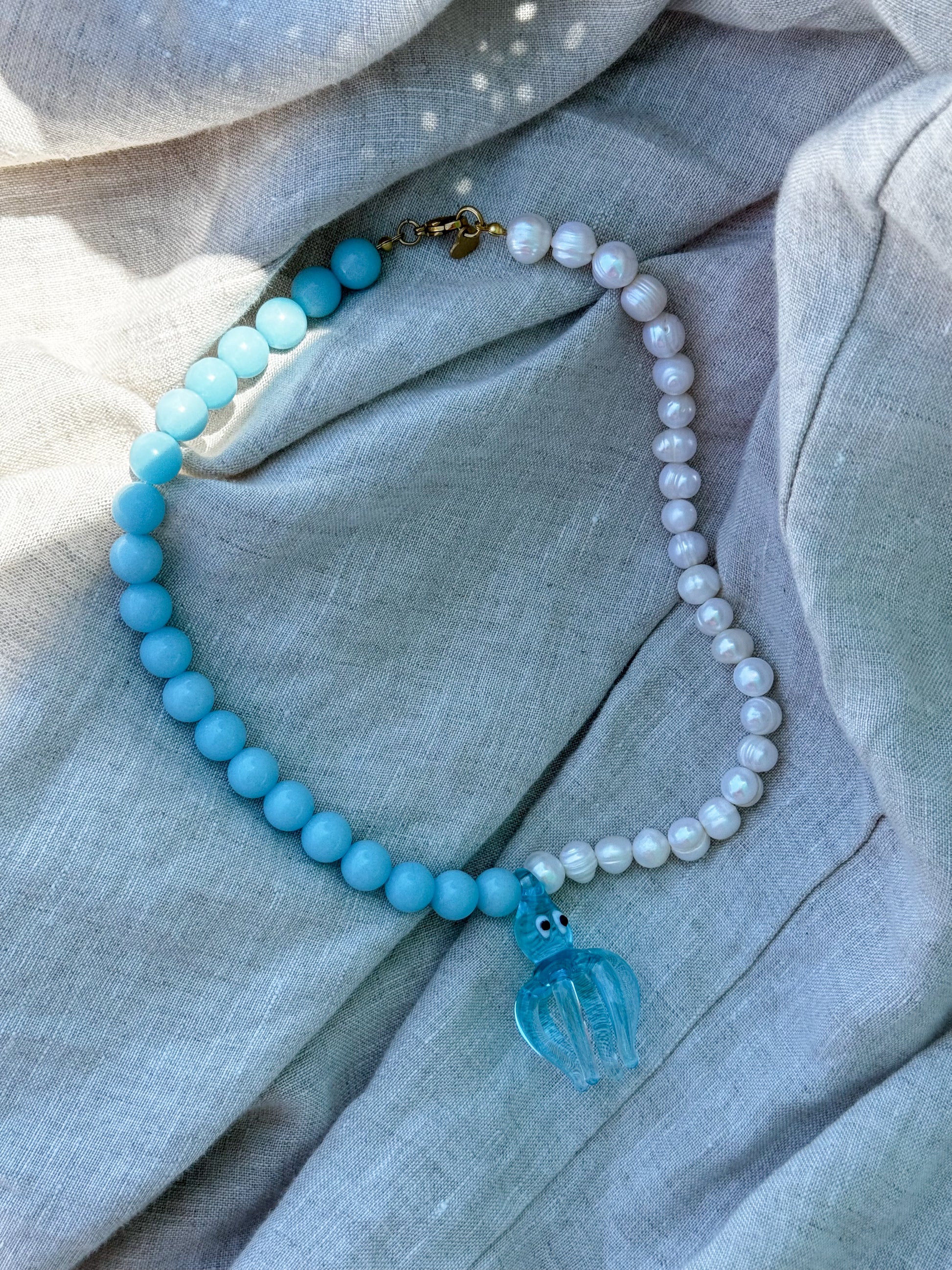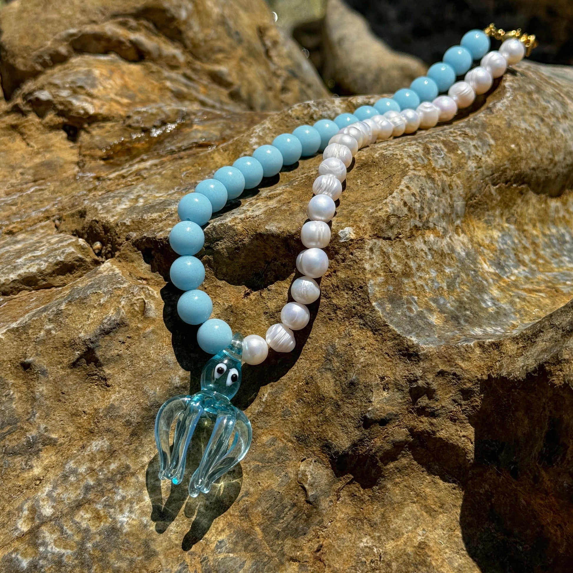 Уникално и артистично ръчно изработено колие, съчетаващо естествени речни перли с мъниста в морски нюанс. Висулката е изработена ръчно и е истински морски талисман, който носи свежест, настроение и индивидуалност.