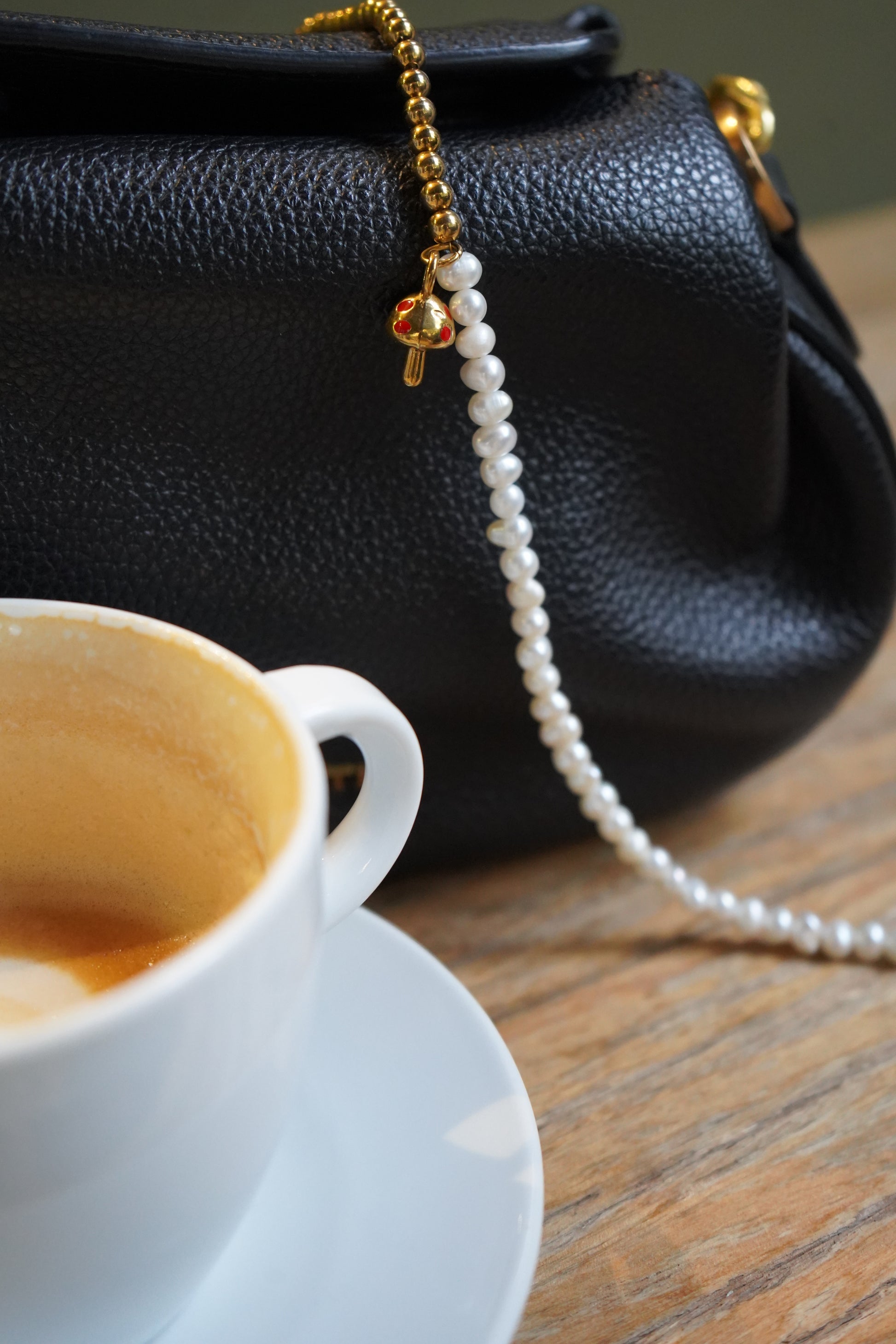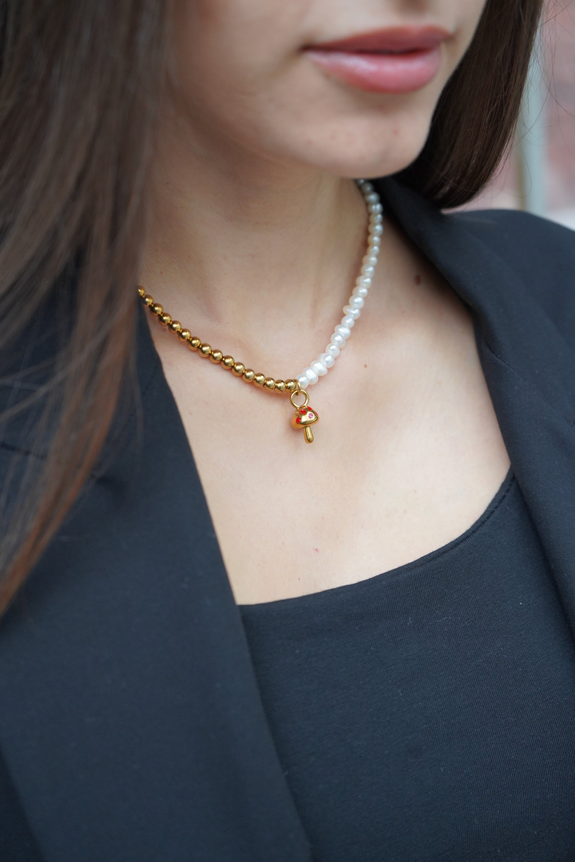Колие "ALICE" комбинира блясъка на неръждаемата стомана с нежността на естествени перли и нестандартен акцент – малка стоманена гъбка, която придава завършеност и индивидуалност.