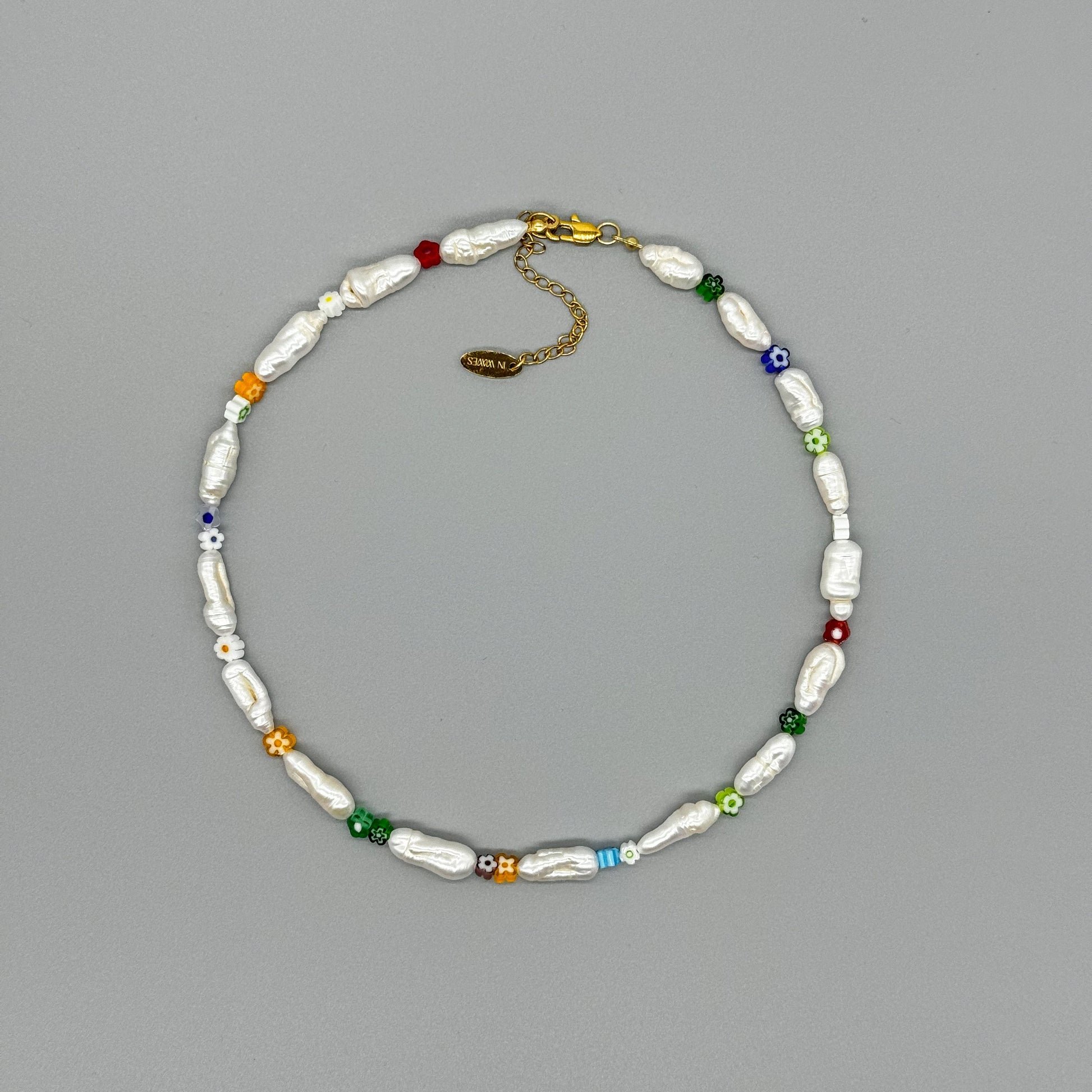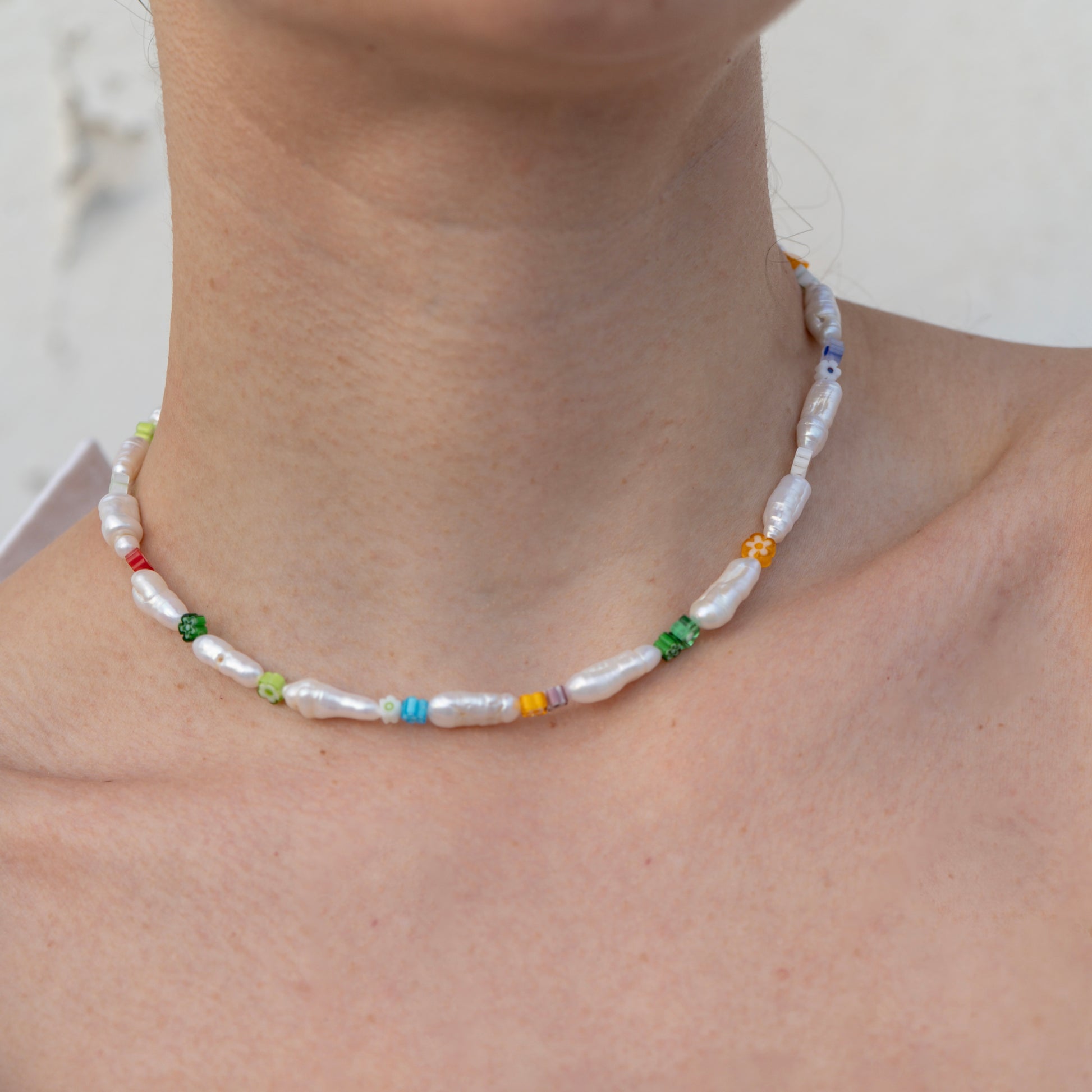 Ръчно изработено колие от естествени речни перли в нестандартна форма и цветни мъниста. Уникален аксесоар за онези, които обичат да носят изкуство и настроение.