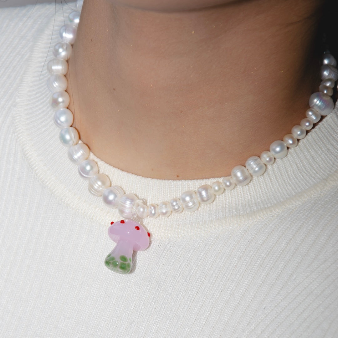 Колие като извадено от вълшебна градина – естествени перли в свободна подредба, всяка с различен размер, обгръщат акцентна гъбка от стъкло. Идеално за любителите на различното, които търсят бижута с душа.