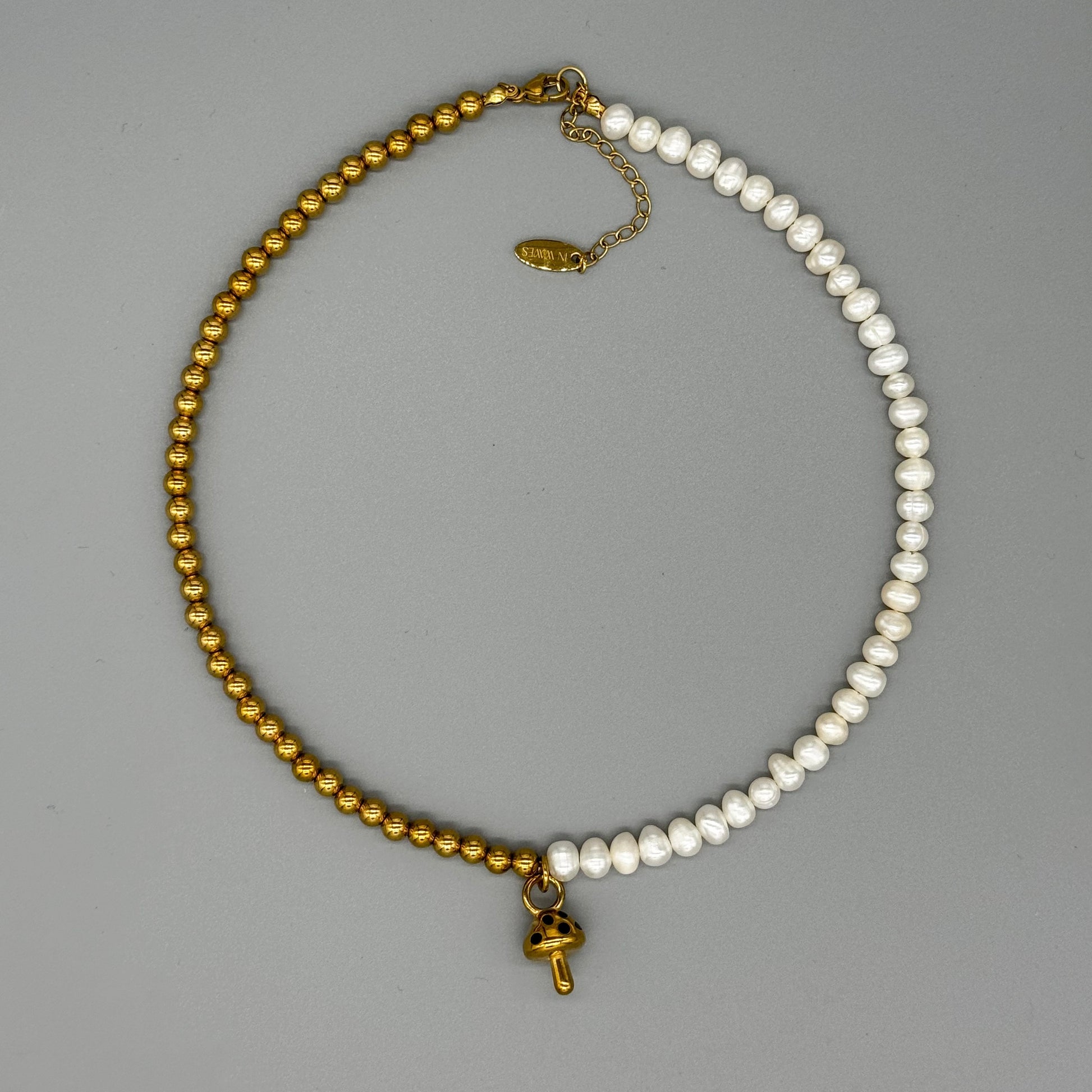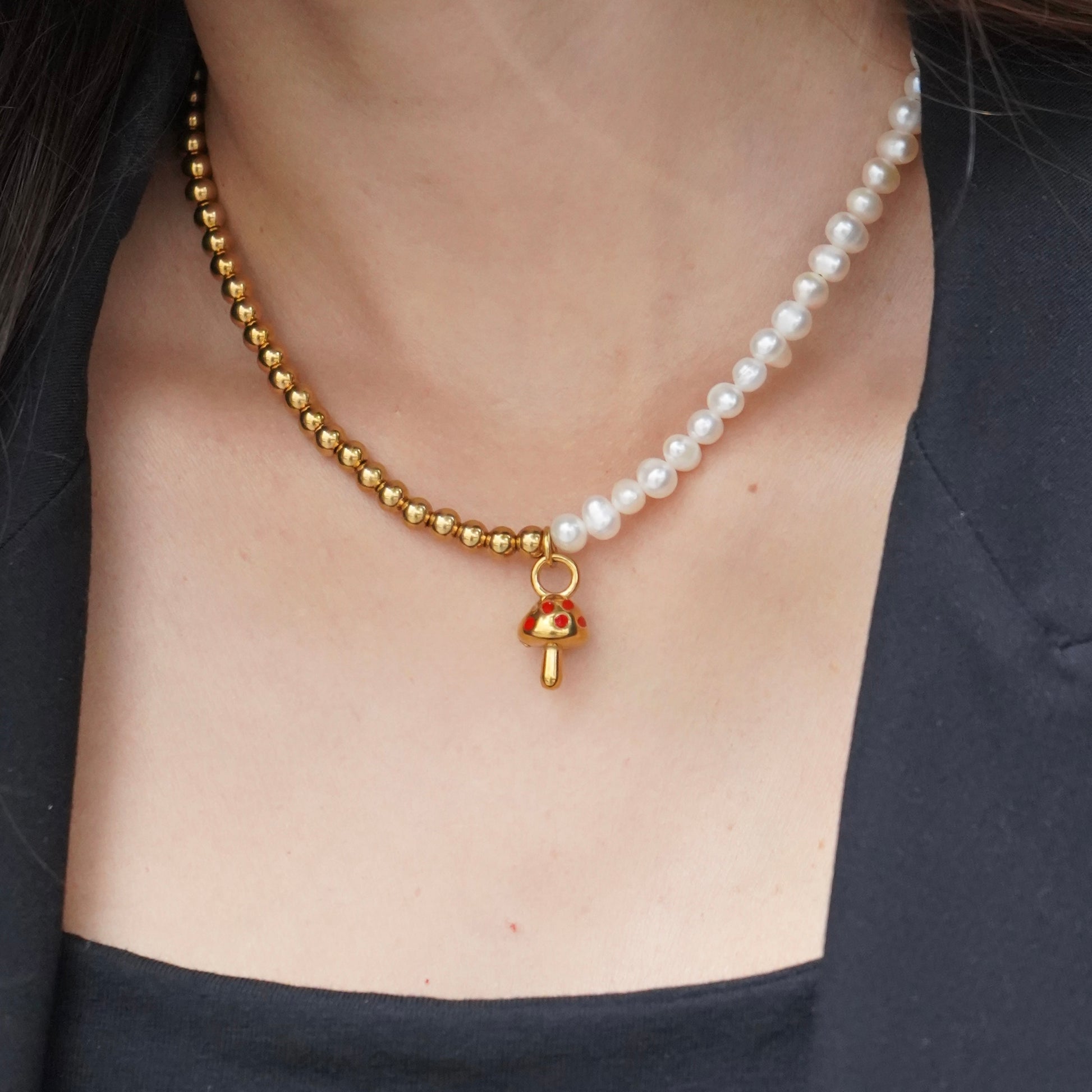 Колие "ALICE" комбинира блясъка на неръждаемата стомана с нежността на естествени перли и нестандартен акцент – малка стоманена гъбка, която придава завършеност и индивидуалност.